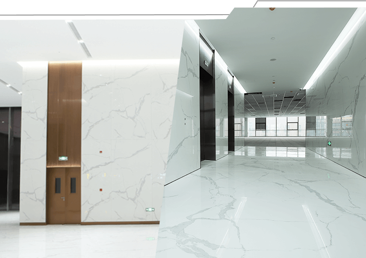 为追求高端而简洁的装饰效果,尚景智谷一楼大厅及各标准层电梯厅全面使用诺贝尔超大岩板,岩板单块尺寸3.2米*1.6米,每块岩板面积达5.12平米,墙面与地面累计使用超8000平米,是目前国内最大的超大岩板项目,也是诺贝尔全国示范项目。南通三建装饰公司承接岩板施工,项目已申报中国建筑装饰协会国优奖。